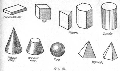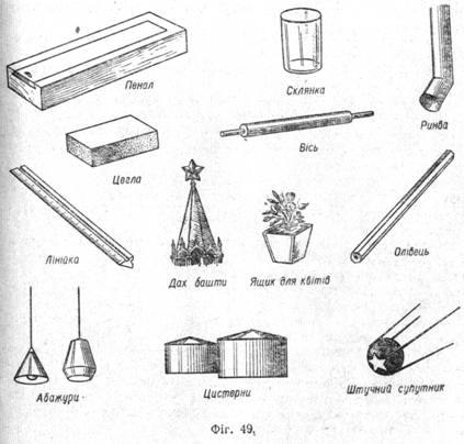 Найпростіші геометричні тіла вам уже відомі з уроків малювання (фіг. 48). Розглядаючи предмети, що показані на фігурі 49, ви можете сказати, яке геометричне тіло лежить в основі кожного з них. Наприклад, форму прямокутного паралелепіпеда мають пенал і цегла. Призматичної форми надано олівцю і масштабній лінійці. Циліндричну форму мають склянка, ринва і технічна деталь — вісь. Дах кремлівської башти являє собою повну піраміду. Ящик для квітів має форму зрізаної піраміди. Форму зрізаного конуса мають абажури, а форму повного конуса— дахи цистерн. Штучний супутник має форму кулі.