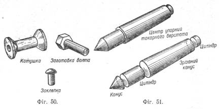 Кожний предмет можна уявно розчленувати на найпростіші геометричні тіла. Наприклад, упорний центр токарного верстата (фіг. 51) легко розчленувати на конус, циліндр, зрізаний конус і циліндр.
