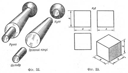 Ручка — (фіг. 52) може бути розчленована на циліндр, зрізаний конус і кулю. Звідси ясно, що насамперед треба знати, як зображаються на кресленнях найпростіші геометричні тіла. Знаючи, який вигляд мають проекції цих тіл, неважко уявити форму тіла в цілому.