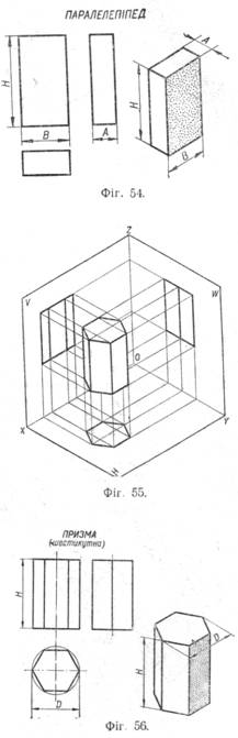 Куб і паралелепіпед. На кре-сленні куба (фіг. 53) досить зазначити один розмір, що характеризує довжину, ширину і висоту. На кресленні паралелепіпеда (фіг. 54) нанесені три розміри: довжина (В), ширина (А) і висота (Н).