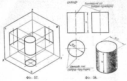 на площину W і одержання його профільної проекції. При виконанні креслення циліндра або предмета у вигляді циліндра можна обмежитись двома проекціями з трьох, наведених на фігурі 58, а саме: фронтальною і горизонтальною.