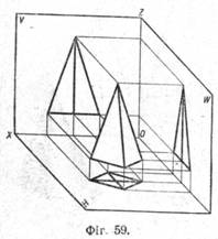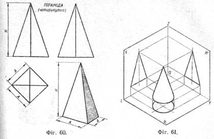 Для циліндра зазначають два розміри — діаметр основи циліндра (D) і висоту (Н). На проекціях циліндра обов'язково проводять геометричні осі і центрові лінії, як це показано на кресленні.Правильна чотирикутна піраміда. На фігурі 59 показано проектування правильної чотирикутної піраміди на площини У, Н і W. Піраміда розміщена основою паралельно площині H, причому її бокові грані нахилені до всіх трьох площин проекцій.