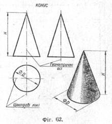 Для конуса зазначають теж два розміри — діаметр основи конуса (D) і висоту (Н). На проекціях конуса наносять геометричні осі і центрові лінії.