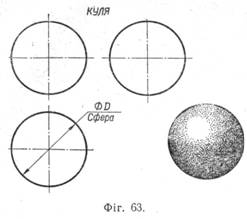 Куля. На фігурі 63 показано креслення кулі. Всі три її проекції однакові, тому кулю досить зобразити в одній проекції з доданням напису «Сфера». Для визначення за кресленням форми деталі необхідно уважно роздивитися проекції і, порівнюючи їх між собою, з'ясувати, які геометричні тіла вони зображають.