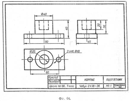 Спробуємо прочитати креслення деталі (фіг. 64). 1. З кутового штампа (основного напису) дізнаємось, що на кресленні зображено деталь, яка називається корпусом підп'ятника. Матеріал, з якого вона буде виготовлена,— чавун. Напис на штампі М1 : 1 свідчить, що креслення виготовлене в масштабі 1:1, тобто деталь зображено в натуральну величину.