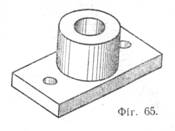 2. За фігурами проекцій визначаємо, що зовнішня форма підп'ятника складається з паралелепіпеда і циліндра, який примикає до середини його верхньої основи. У верхній частині циліндра є ненаскрізний (глухий) отвір. Два наскрізних циліндричних отвори проходять через паралелепіпед. Після такого розгляду можна уявити собі деталь в цілому (фіг. 65).