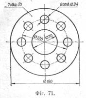 Можна наносити розмір діаметра кола інакше, як наприклад 0190 на фігурі 71. Тут приведено дві виносні і одна розмірна лінії. Розмірне число із знаком діаметра (0190) написано ближче до середини розмірної лінії. На фігурі 71, б для зазначення діаметрів 8 однакових отворів проведена на одному з кіл розмірна лінія з поличкою, над якою зроблено напис — 8 отв. 024 (вісім отворів діаметром 24 мм). Причому стрілки розмірної лінії на кресленні впираються в коло ззовні. Таке зображення стрілок прийнято в тих випадках, коли діаметр кола на кресленні дорівнює 12 мм і менше.