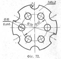 При виконанні креслення прокладки (фіг. 71) треба уміти ділити коло на 8 рівних частин, а при виконанні креслення пластини (фіг. 72) — на 6 рівних частин.