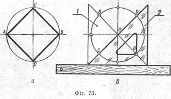 Для ділення кола на 8 рівних частин треба провести дві пари взаємно перпендикулярних діаметрів. Одна пара — центрові лінії, друга пара — під кутом 45° до них (фіг. 73, б). З'єднавши точки ділення, дістанемо правильний вписаний многокутник.