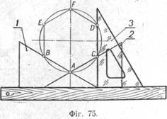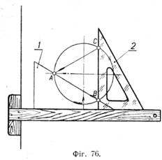 Ділення кола на три рівних частини за допомогою косинця з кутами 30°—60°—90° (фіг. 76). Спочатку косинець установимо так (положення 1), що його малий катет буде паралельний вертикальній центровій лінії, а гіпотенуза суміщена з точкою А перетину горизонтальної центрової лінії з колом; при цьому визначимо і другу точку В ділення — в місці перетину гіпотенузи з колом. Третю точку С визначимо після перекладання косинця в положення 2, при якому його більший катет паралельний вертикальній центровій лінії і суміщений з точкою В ділення.