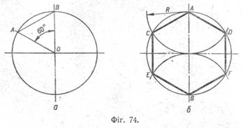 На фігурі 74, б коло поділено на 6 рівних частин за допомогою циркуля. В цьому прикладі за дві точки ділення візьмемо точки А і В перетину вертикальної центрової лінії з колом. Чотири інших точки С, D, Е і F дістанемо в місцях перетину кола допоміжними дугами, проведеними з точок А і В, як з центрів. Радіус цих дуг дорівнює радіусу кола. З'єднавши кожні дві сусідні точки ділення, побудуємо вписаний правильний шестикутник.