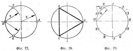 Ділення кола на три рівні частини за допомогою циркуля (фіг. 77). На даному прикладі за одну з трьох точок ділення візьмемо точку А перетину горизонтальної центрової лінії з колом. Дві інші точки В і С дістанемо в місцях перетину кола допоміжними дугами, проведеними з точки D, як з центра, причому радіус цих дуг дорівнює радіусу R кола, що ділиться. З'єднавши прямими точки ділення, побудуємо вписаний правильний трикутник (фіг. 78).