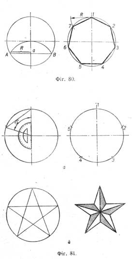 Ділення кола на 7 рівних частин виконується так: поділивши коло на 3 рівних частини, маємо хорду АВ, що дорівнює стороні правильного вписаного трикутника (фіг. 80). Половина цієї хорди з достатнім наближенням дорівнює стороні правильного вписаного семикутника.