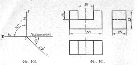 На фігурі 99 показано такий випадок фронтальної косокутної проекції, коли вісь OY складає з віссю ОХ кут 45°. На кожній осі фіг. 100 вказані відношення 1 : 1 або 1 : 2. Це означає, що всі розміри зображення в напрямах, паралельних осям ОХ і OZ, відкладають без спотворення, а розміри, паралельні осі OY, скорочують вдвоє.