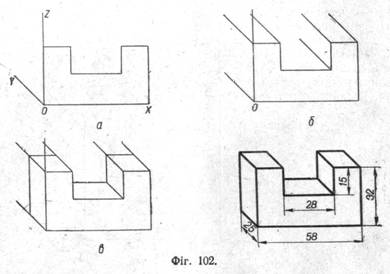 1. Проводимо осі фронтальної проекції, потім в площині XOZ будуємо таке саме зображення, як і вигляд спереду на кресленні (фіг. 102, а).