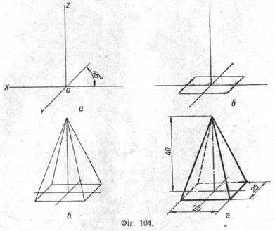 На осі OZ відкладаємо розмір висоти піраміди і проводимо ребра піраміди, з'єднуючи прямими вершини кутів основи з вершиною піраміди (фіг. 104, в).