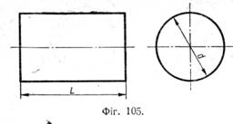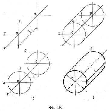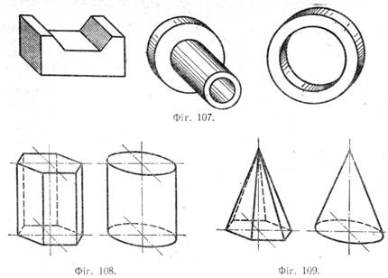 При побудові фронтальної проекції циліндра осі зручно напрямити так, щоб вісь 0Y збігалася з віссю циліндра, а осі ОХ і 0Z — з центровими лініями основи циліндра. Проведемо вісь 0Y і на ній відкладемо відрізок, що дорівнює половині висоти циліндра (фіг. 106, а). Потім з кінців відрізка, як з центрів, проведемо два кола, діаметри яких дорівнюють діаметру основи циліндра. Ці кола зображають основи циліндра — передню і задню (фіг. 106, б). З'єднаємо кола лініями, дотичними до них (фіг. 106, в). Обведемо фронтальну проекцію і нанесемо розміри (фіг. 106, г). Фронтальні проекції застосовують у тих випадках, коли хочуть зберегти неспотвореними площини, що розміщені паралельно фронтальній площині проекцій (фіг. 107). В решті випадків складається враження деякої перекошеності предмета. Так на фіг. 108 і 109 наведені фронтальні проекції призми, циліндра, піраміди і конуса, у яких основи розміщені горизонтально, а не фронтально. Уявна перекошеність особливо помітна у циліндра і конуса.