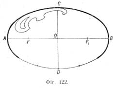 Еліпсом (фіг. 122) називається замкнута плоска крива, що має такі геометричні властивості: сума відстаней будь-якої її точки до двох точок, що називаються фокусами (F і F1) еліпса, є величина стала, що дорівнює великій осі еліпса (АВ).