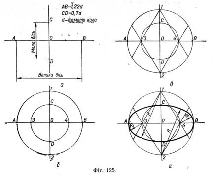 У кресленні допускається для простоти і прискорення побудов креслити замість еліпсів овали, що складені з дуг кіл і дуг, що проводяться по лекалу. Розглянемо порядок креслення овала (замість еліпса) за розмірами великої і малої осей еліпса (фіг. 125).