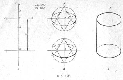 У першій стадії (фіг. 126, а) проведено вісь Z, на якій відкладено відрізок ОО1, що дорівнює заданій висоті циліндра, після чого через точки О і О1 проведено горизонтальні лінії. Далі визначено розміри великої і малої осей еліпса і відкладено від точок О і О1.