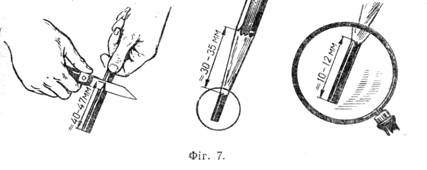 Підготовка олівця до роботи. Правильна підготовка олівця до роботи має велике значення. Дуже важко добре виконати креслення, якщо олівець неправильно підготовлений для роботи. Підготовка складається з двох операцій — застругування дерев'яної частини олівця на ЗО—35 мм і загострювання виступаючого графіту на 10—12 мм (фіг. 7).