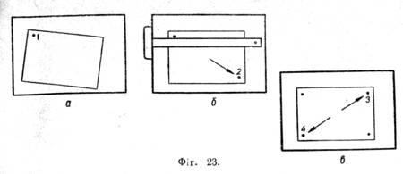 Щоб прикріпити папір до креслярської дошки, краще спочатку злегка закріпити його кнопкою тільки в лівому куті (фіг. 23, а), а потім, пересунувши рейсшину до верхньої частини аркуша, надати його верхньому краю положення, при якому він буде паралельний до лінійки рейсшини (фіг. 23, б). Притиснувши папір до дошки, треба закріпити його в правому нижньому кутку другою кнопкою, а потім і рештою (фіг. 23, в).
