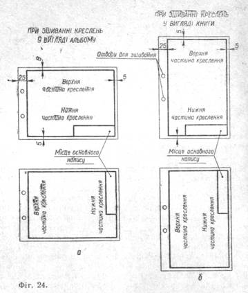 Лінії рамки проводять на відстані 5 мм від верхньої, правої і нижньої меж формату (фіг. 24). Між лівою межею формату і лінією рамки передбачають проміжок в 25 мм для дальшої підшивки (брошурування) креслень.