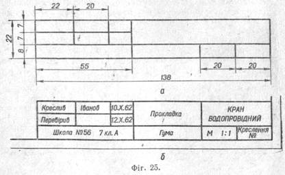 Основний напис. На фігурі 25, а показані форма і розміри основного напису (кутового штампа) для навчальних креслень предметів (деталей). Так само як і рамку креслення, основний напис треба спочатку накреслити тонкими лініями і тільки після закінчення креслення довести до товщини лінії рамки.
