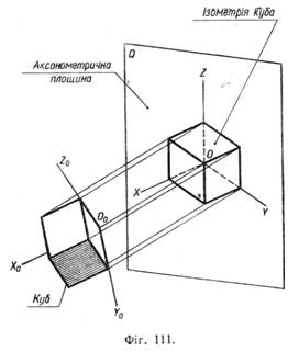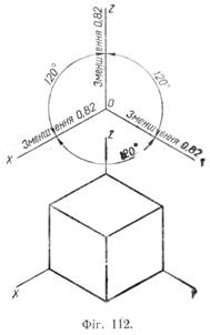 В ізометричній прямокутній проекції проектуючі промені перпендикулярні до аксонометричної площини Q (фіг. 111), що становить з кожною з осей координат О0Х0, O0Y0, O0Z0 однакові кути (35°). Проекції осей координат на аксонометричну площину — аксонометричні осі OX, OY і OZ — утворюють одна з одною кути 120° (фіг. 112). Розміри предмета, відкладені вздовж координатних осей, при проектуванні на аксонометричну площину зменшуються в 0,82 раза.