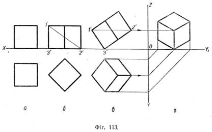 Процес утворення ізометричної проекції можна подати ще й так. На фігурі 113, а дано дві проекції куба (фронтальну і горизонтальну), що стоїть на горизонтальній площині проекцій. При такому положенні куба його проекціями на площині V і H будуть квадрати.