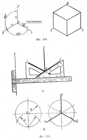 На фігурі 115, а показано прийом побудування ізометричних осей за допомогою косинця з кутами 30°—60°—90°, а на фігурі 115, б — за допомогою циркуля.