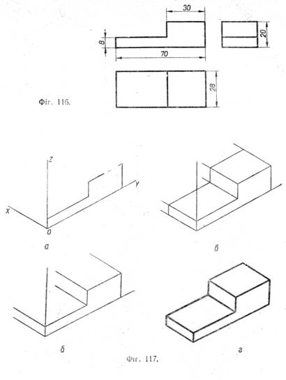1. Проведено осі ізометрії і в площині ZOY побудовано фігуру, що відповідає на кресленні виглядові спереду (фіг. 117, а).