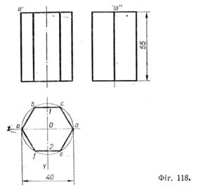 Приклад 2. На фігурі 118 наведено креслення правильної шестикутної призми. Керуючись кресленням, треба побудувати наочне зображення призми в ізометрії.