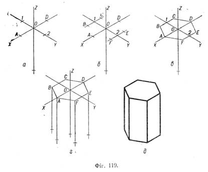 Побудування ізометрії призми за етапами показано на фігурі 119. При цьому фігури 119, а, б і в ілюструють порядок побудування в ізометрії шестикутника (верхньої основи призми). |